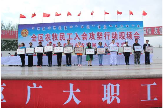 6月14日,全區(qū)農(nóng)牧民工入會(huì)攻堅(jiān)行動(dòng)現(xiàn)場(chǎng)會(huì)暨烏蘭察布市農(nóng)牧民工入會(huì)儀式在我市舉行。我公司組織30人的方隊(duì)參加了入會(huì)儀式。期間,自治區(qū)人大常委會(huì)副主任、總工會(huì)主席杭桂林,自治區(qū)總工會(huì)黨組書(shū)記、副主席崔明龍,自治區(qū)總工會(huì)副主席王麗紅,我市領(lǐng)導(dǎo)張琛、李建平、楊國(guó)文、王增強(qiáng)、王國(guó)相、于生龍,和各盟市工會(huì)分管主席、主管部門(mén)部長(zhǎng),各盟市黨委政府所在地的區(qū)(市、旗)總工會(huì)主席,各自治區(qū)產(chǎn)業(yè)工會(huì)負(fù)責(zé)人,自治區(qū)直屬機(jī)關(guān)工會(huì)工委負(fù)責(zé)人,區(qū)總相關(guān)部門(mén)負(fù)責(zé)人,市各旗縣市區(qū)工會(huì)負(fù)責(zé)人及部分市直基層工會(huì)負(fù)責(zé)人100余人來(lái)我公司進(jìn)行了實(shí)地觀摩考察。